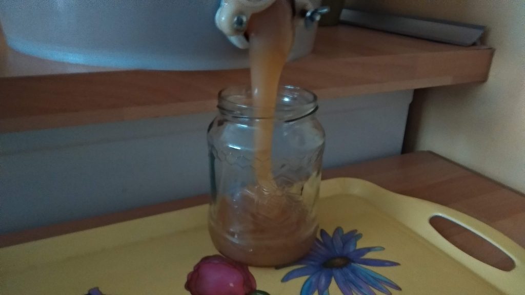 Letos medobrání proběhlo na třikrát. Jarní med začátkem června na dvě etapy. Letní pak začátkem července za velkého vedra v jeden den! A to z osmero včelstev.